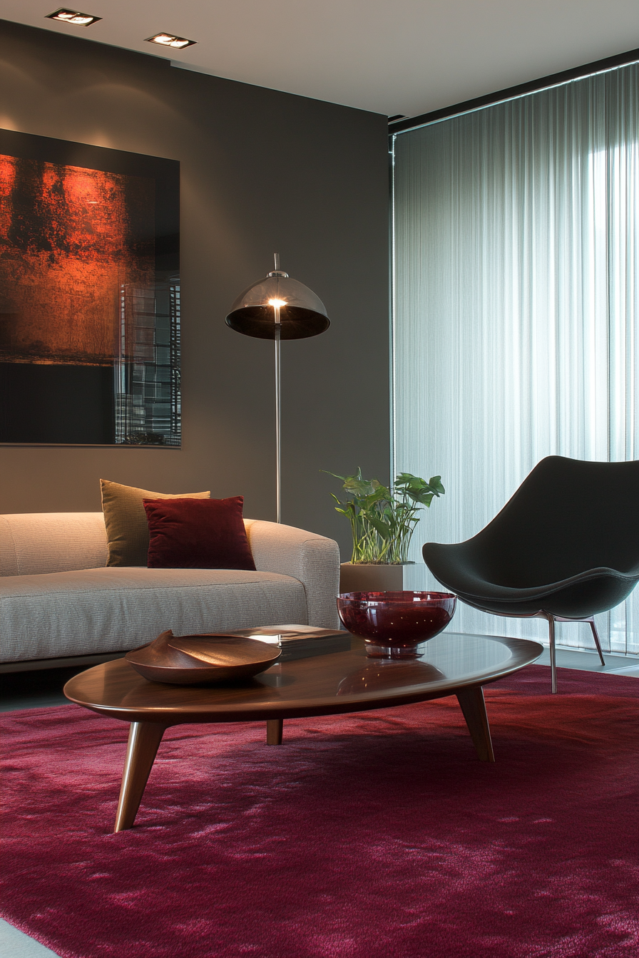 Sleek leather and acrylic furnishings complement the rich charcoal and burgundy pairing.