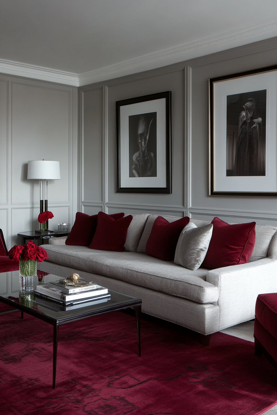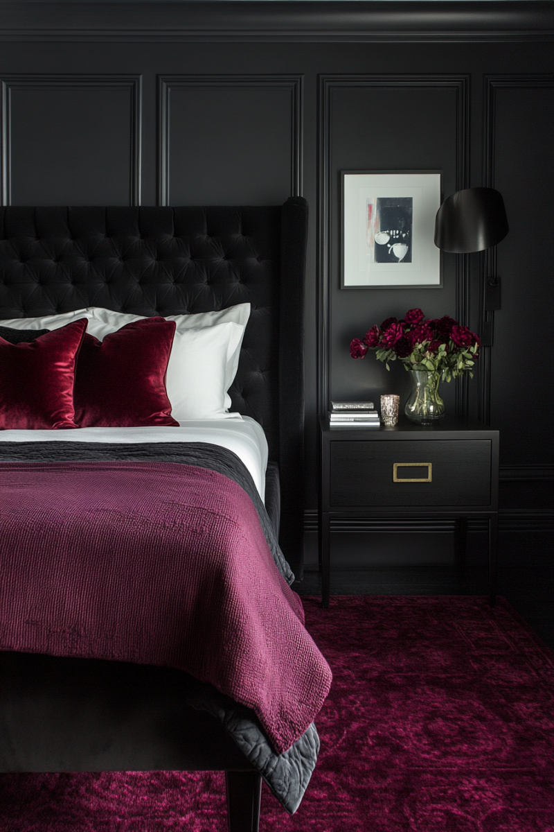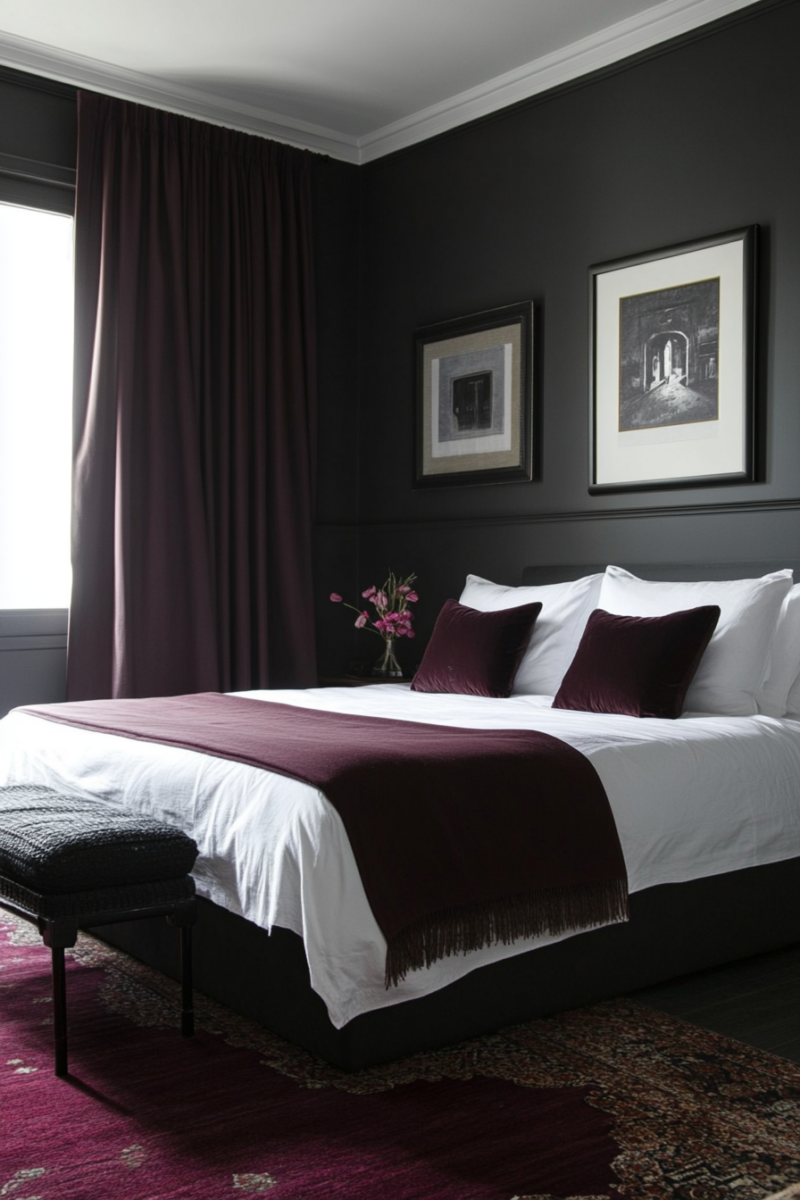 Burgundy and charcoal together create an elegant, chic ambiance perfect for formal living spaces or master suites.