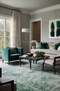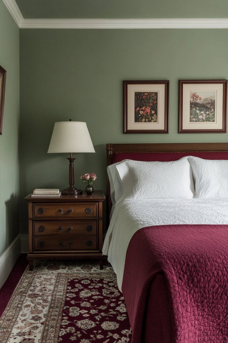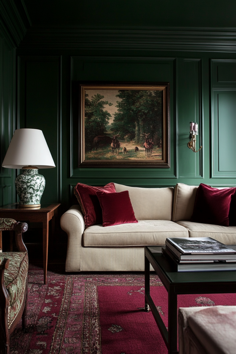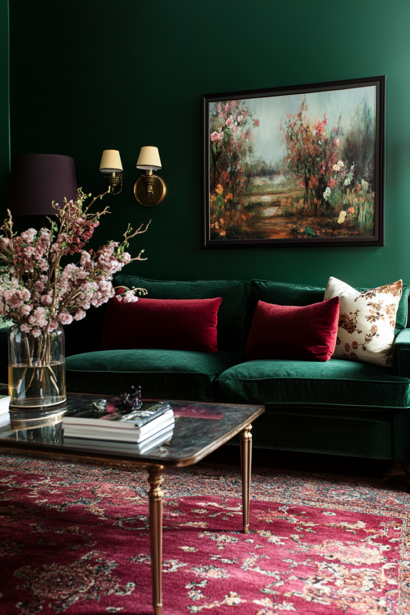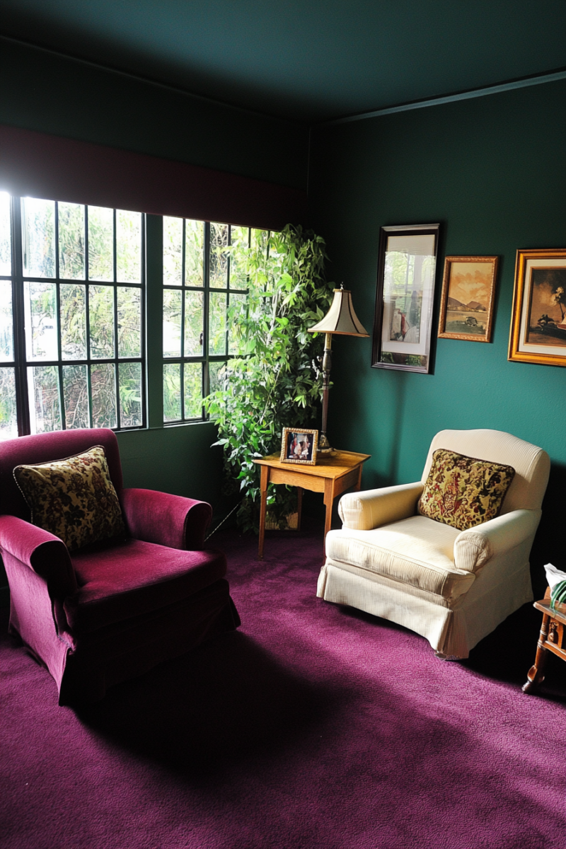 For a bold, nature-inspired look, deep forest green is a stunning match for burgundy carpet.