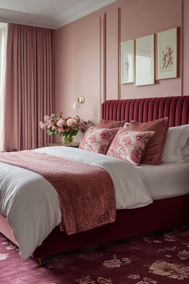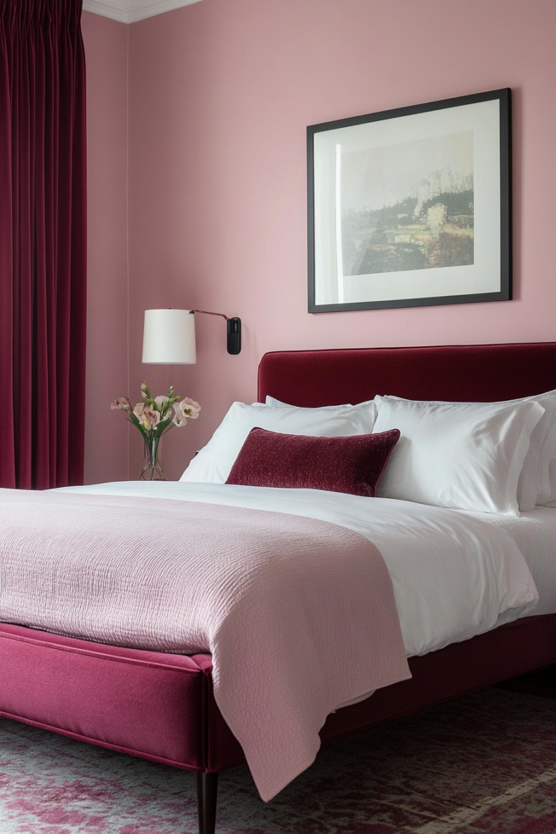 For a more modern mood, mix in glossy black accents and sleek metallics with the pink and burgundy combo.