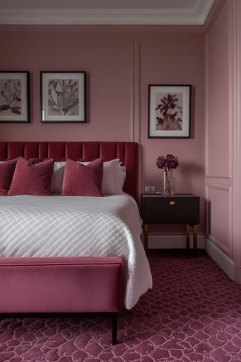 When done right, blush or rose pink can actually be quite sophisticated with burgundy carpet.