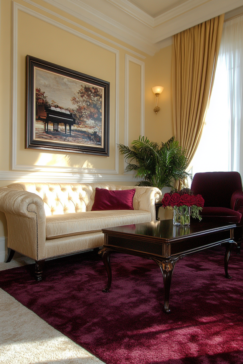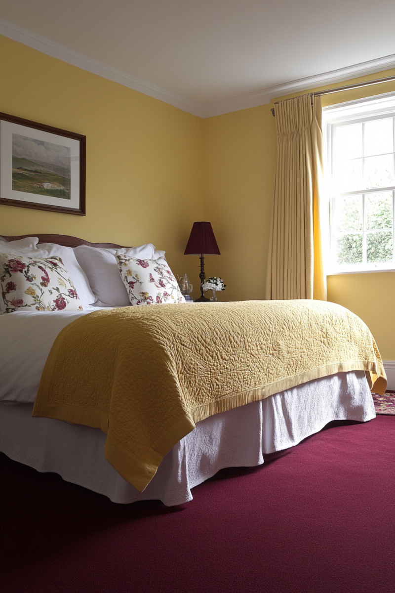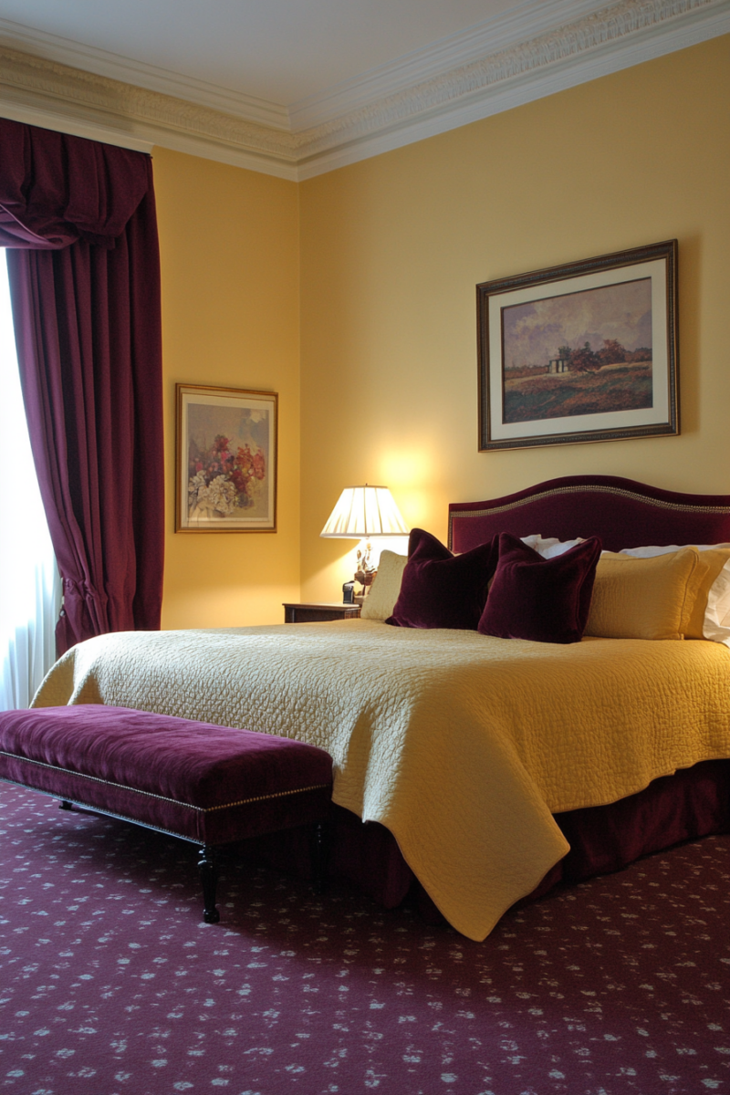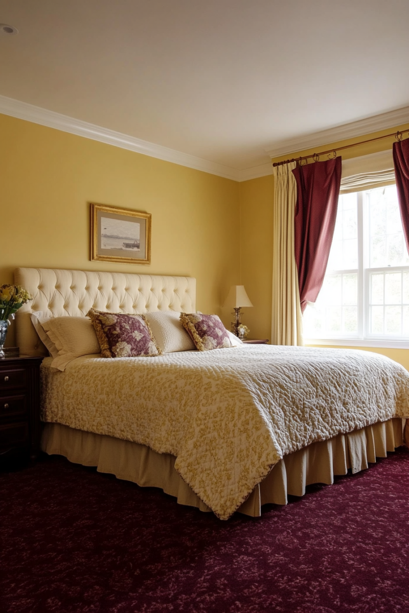Cheerful, sunny yellow can actually pair beautifully with burgundy carpet for an uplifting ambiance.