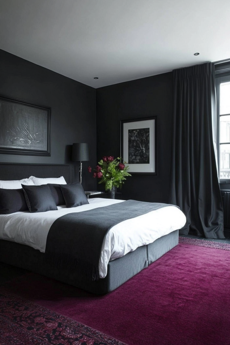 Charcoal gray intensifies and modernizes the luxurious feel of burgundy carpeting.