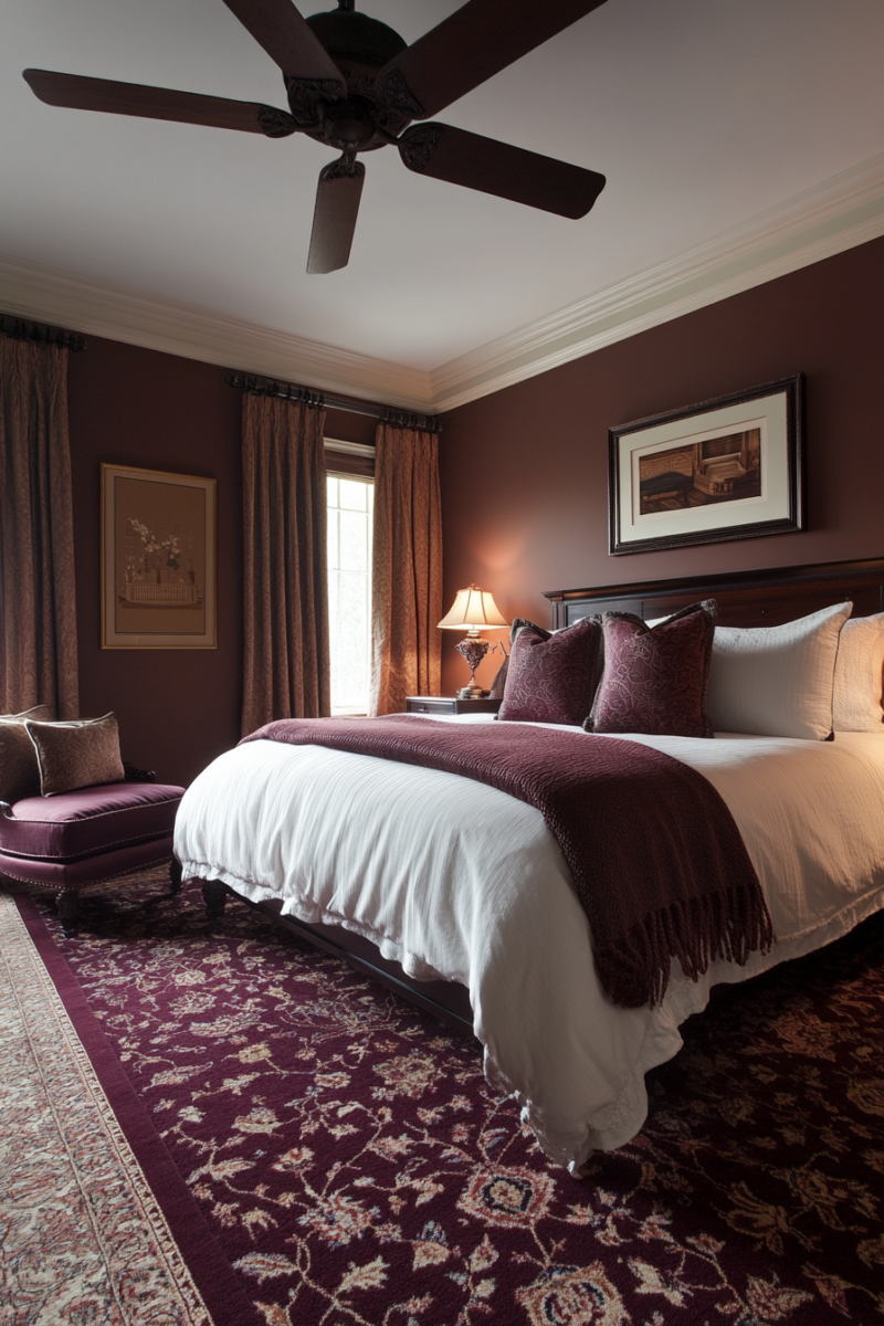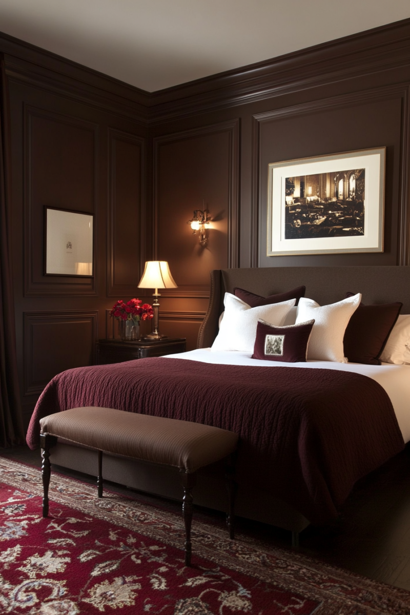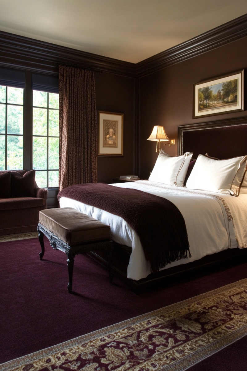 Chocolate brown walls intensely accentuate the depth and dimension of burgundy carpeting.