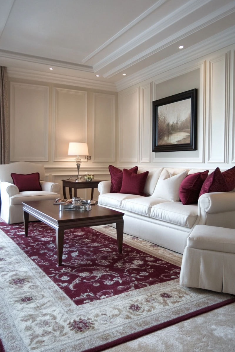 Too stark white risks clashing with the burgundy carpet’s rich hue.