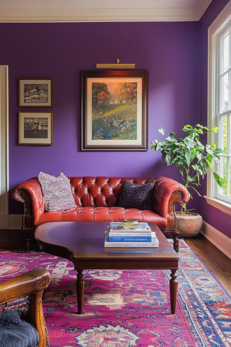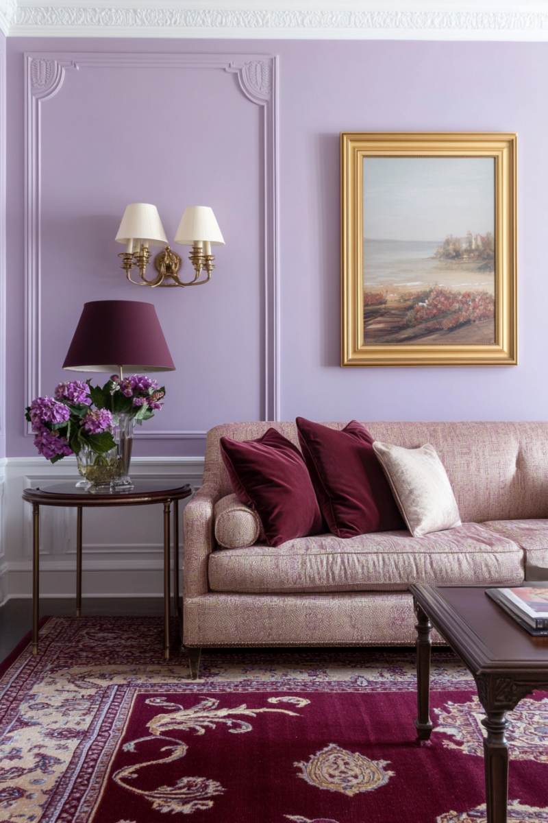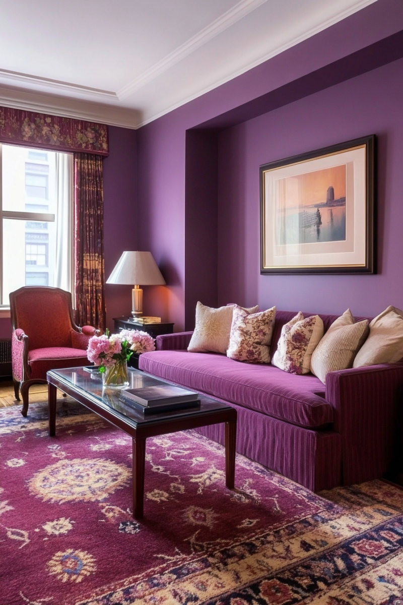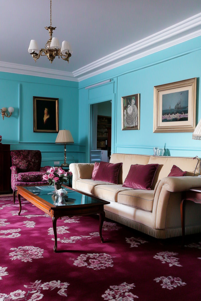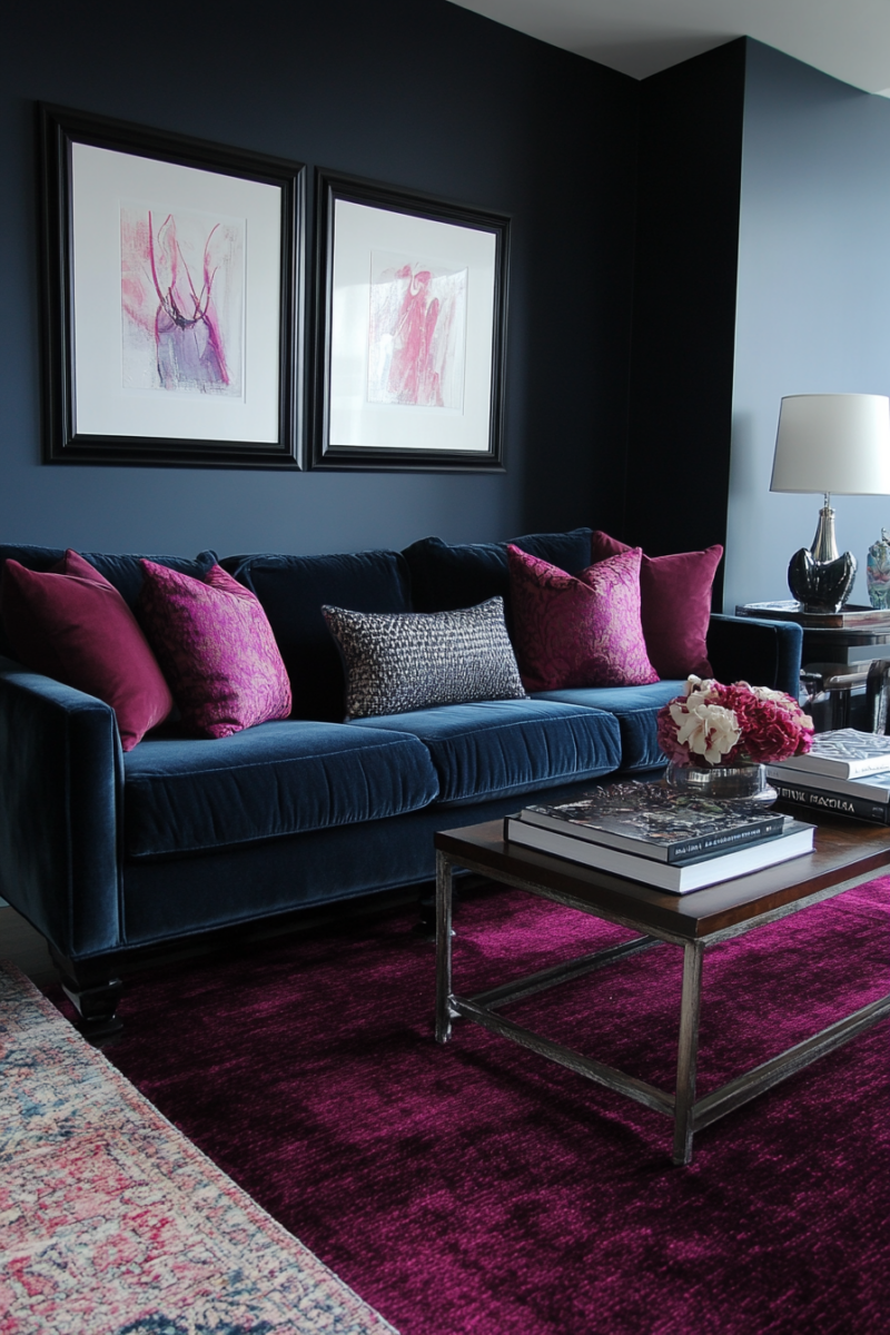 Too much pink or purple risks competing with the carpet.