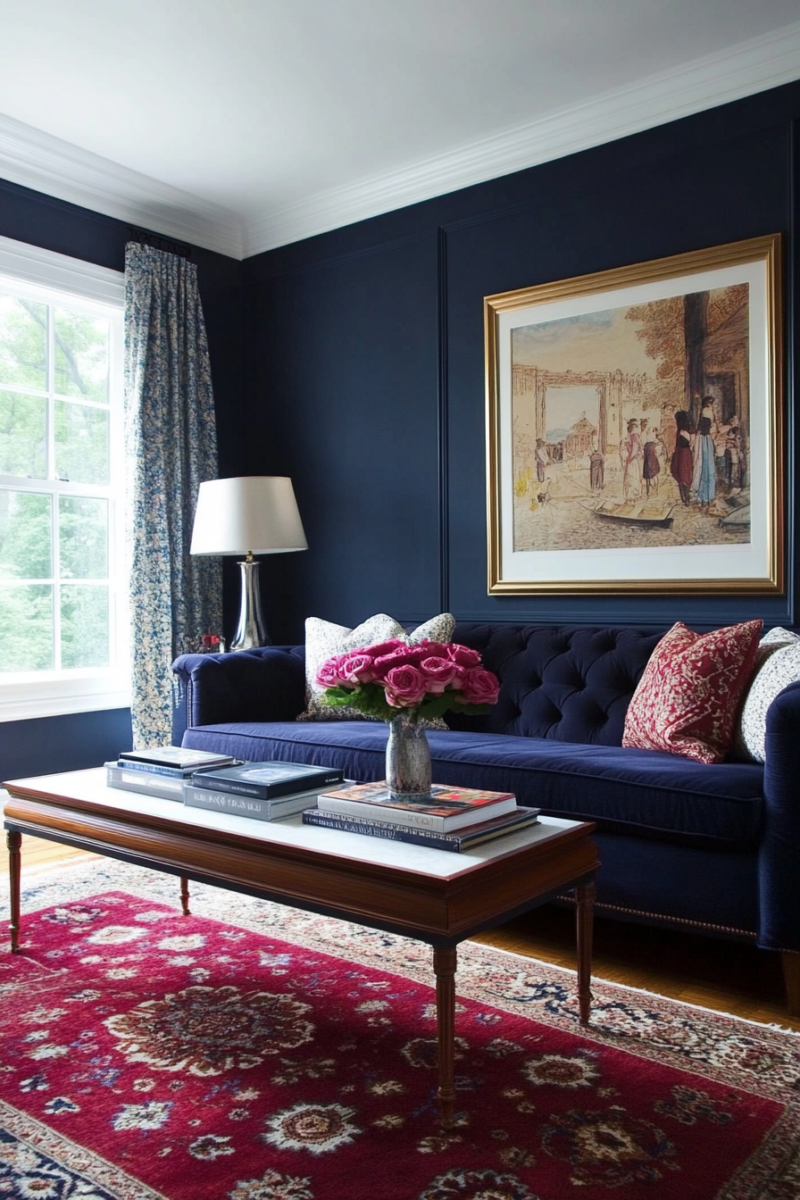 Using navy on the ceiling as well enhances the enveloping effect.