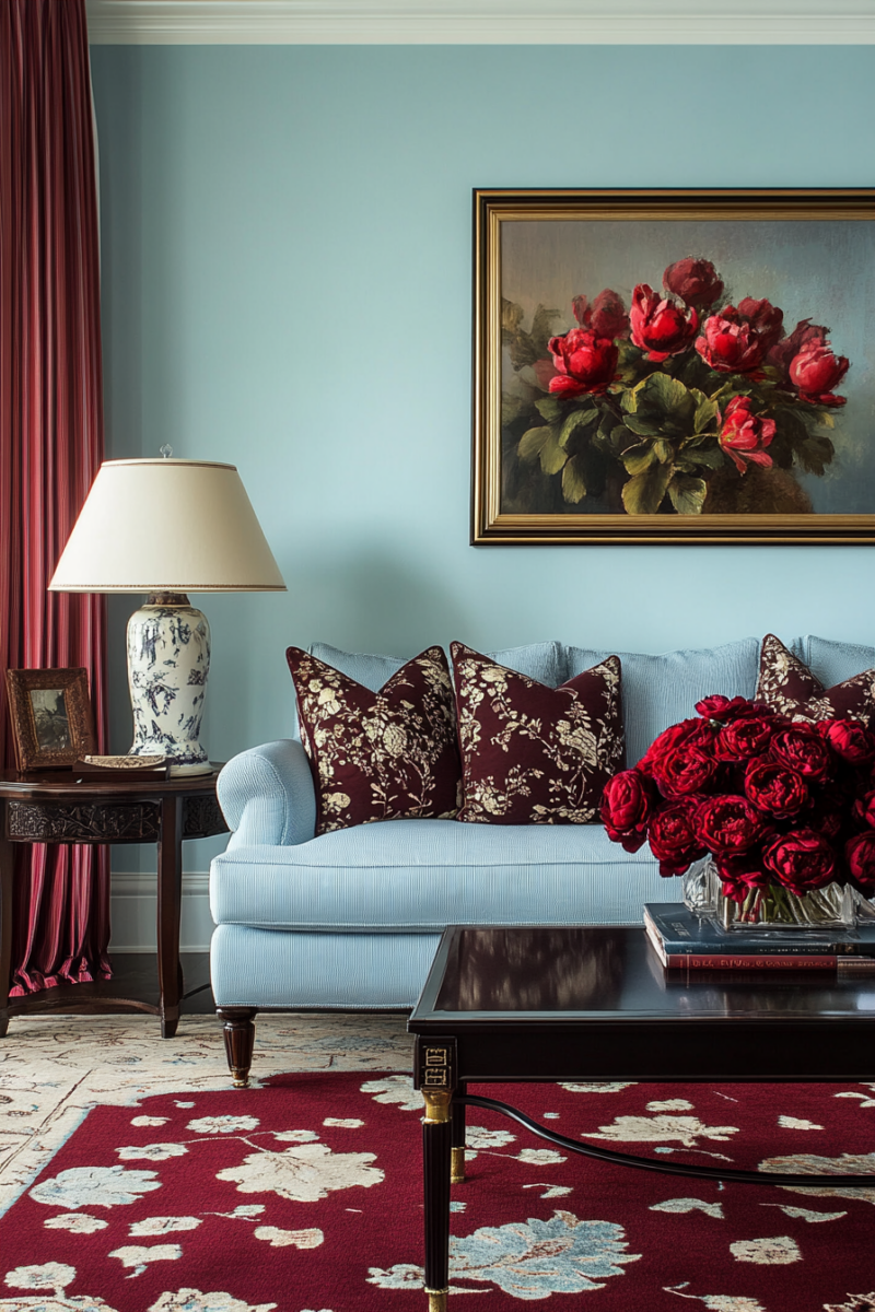 Robin’s egg blue has a vintage flair that complements burgundy’s old world elegance beautifully.