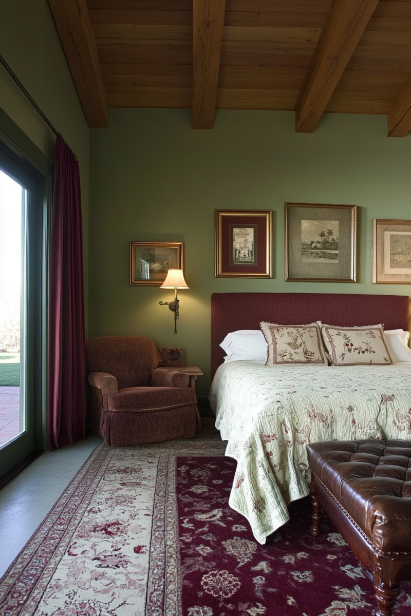 Rough-hewn wood furnishings and iron accents enhance the organic charm of green and burgundy together.