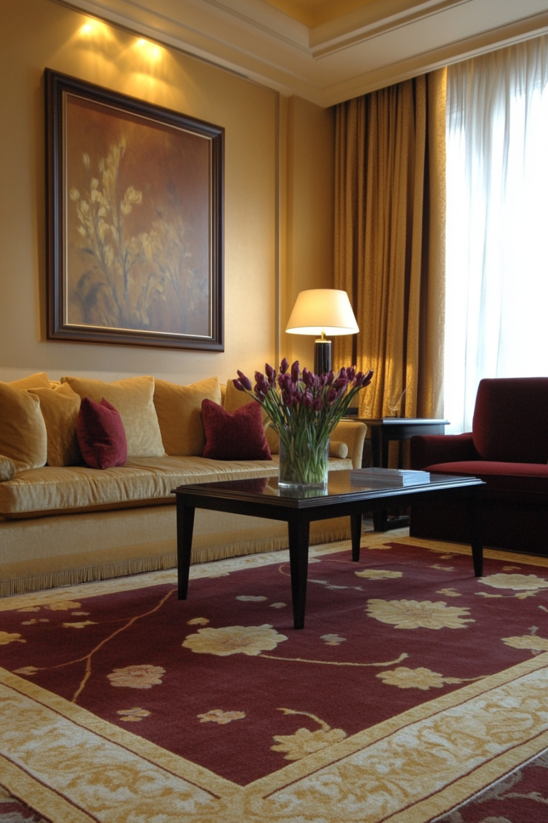 Soft metallic gold adds a luxe elegance and brings out the golden highlights in burgundy carpet beautifully.