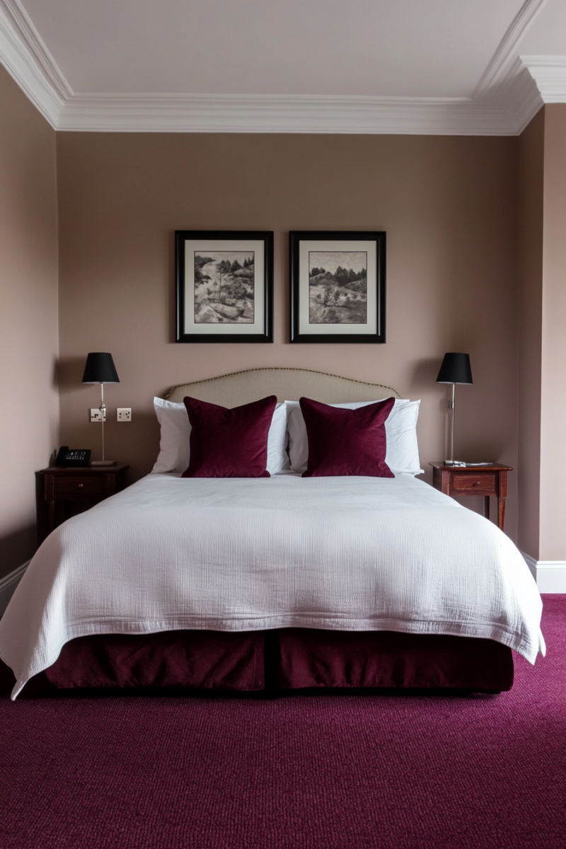 Subtle, neutral taupe walls allow the beauty of burgundy carpeting to shine.