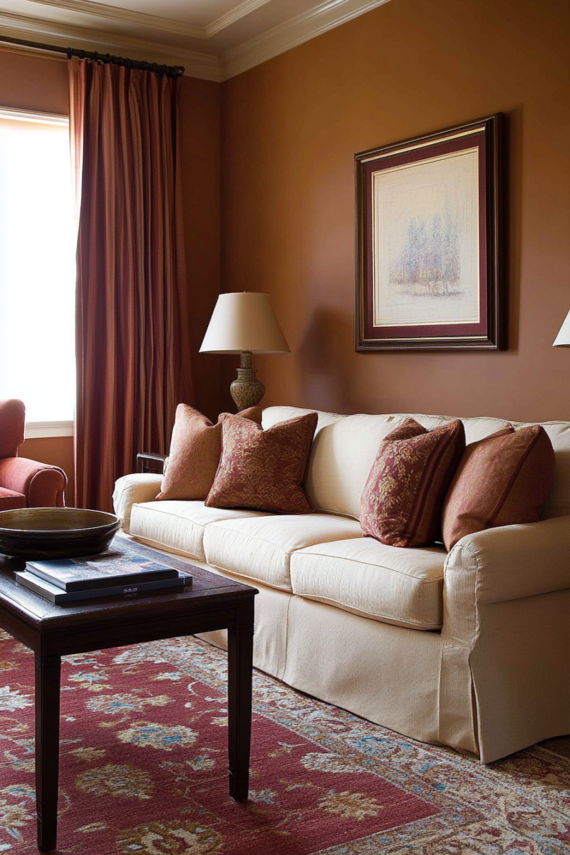 For a cozier feel, use terracotta on an accent wall or fireplace focal point, and keep surrounding walls lighter and brighter.