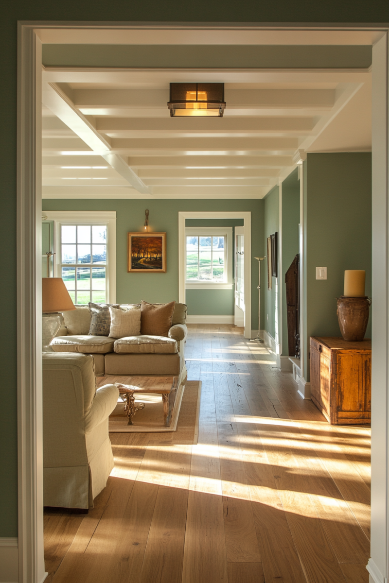 This muted green has gray undertones that balance beautifully with the golden hues of oak floors.