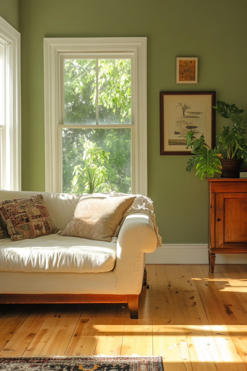 This muted green has warm undertones that pair beautifully with golden oak floors, creating a harmonious and grounded space.