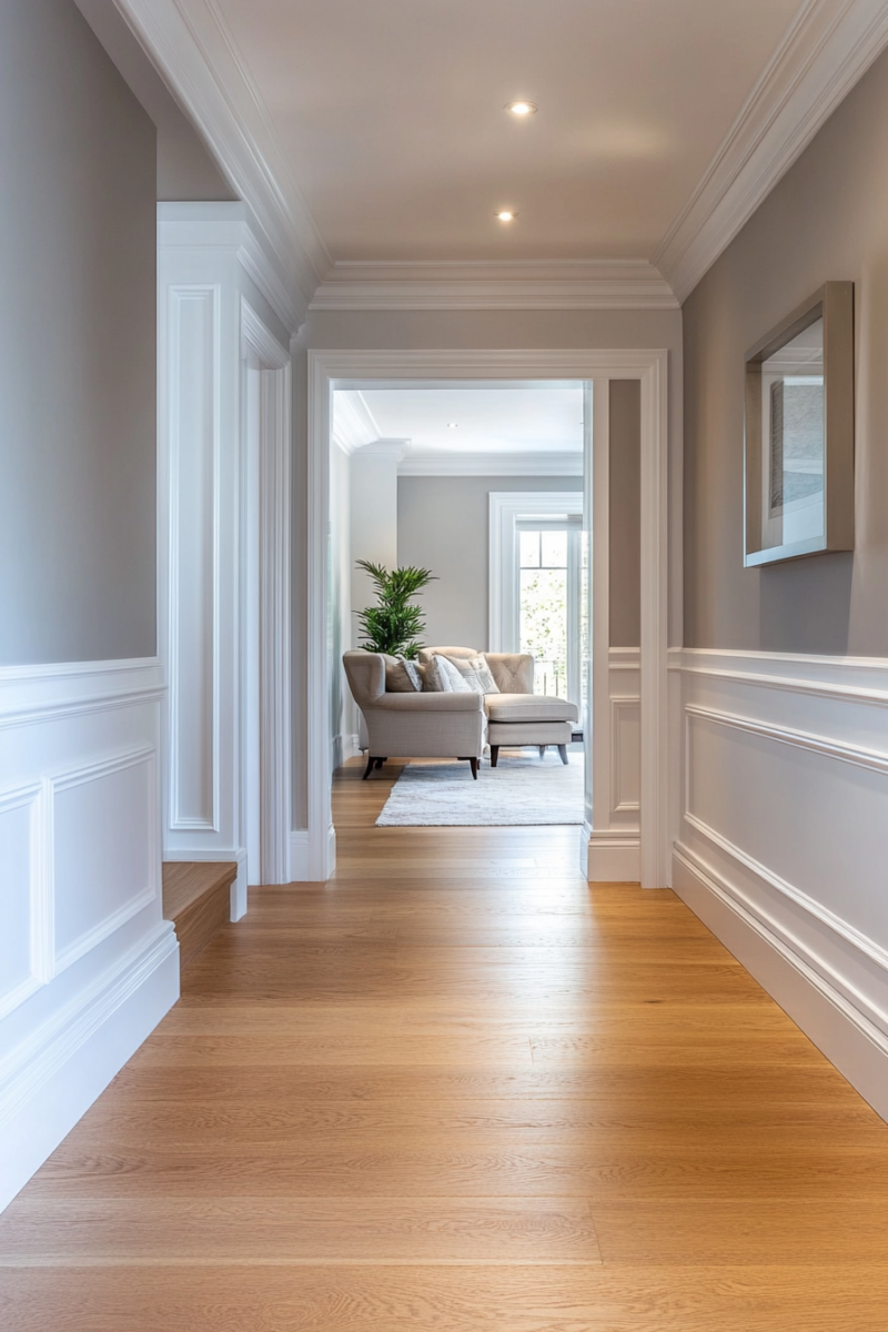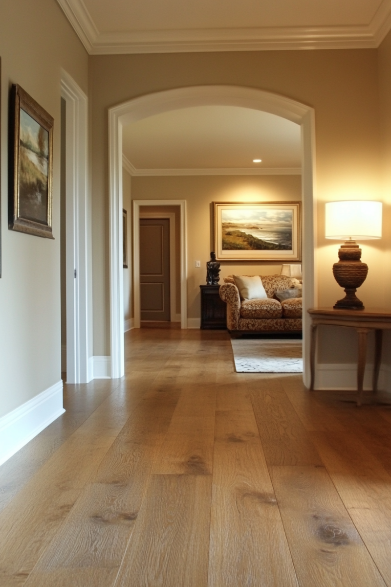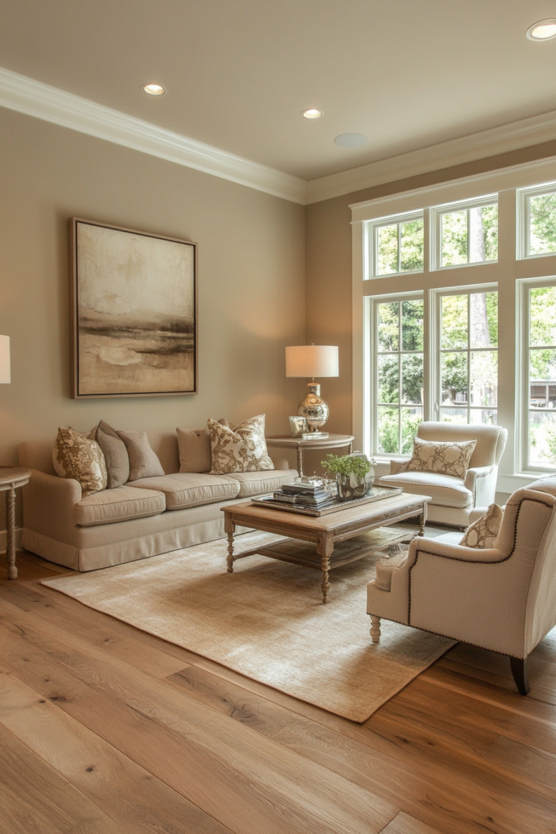 Mushroom beige is another warm-toned neutral that complements golden oak floors beautifully.