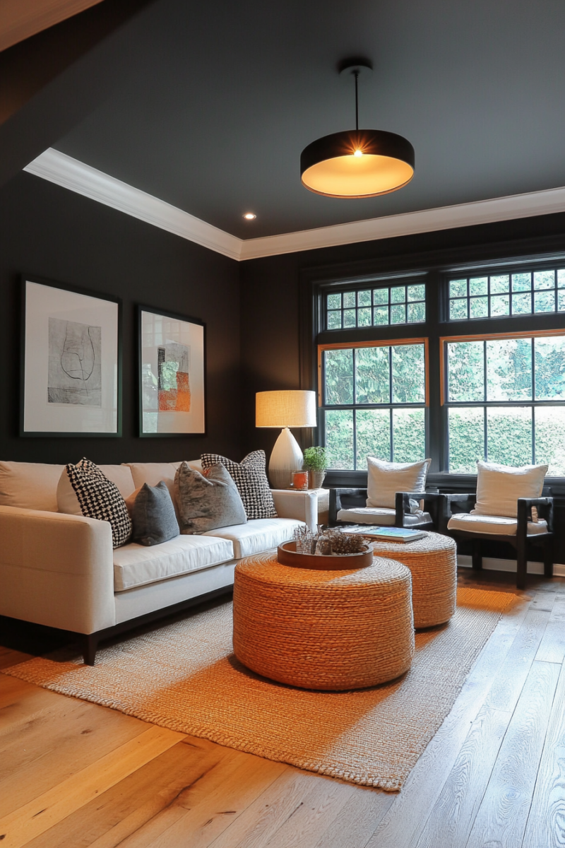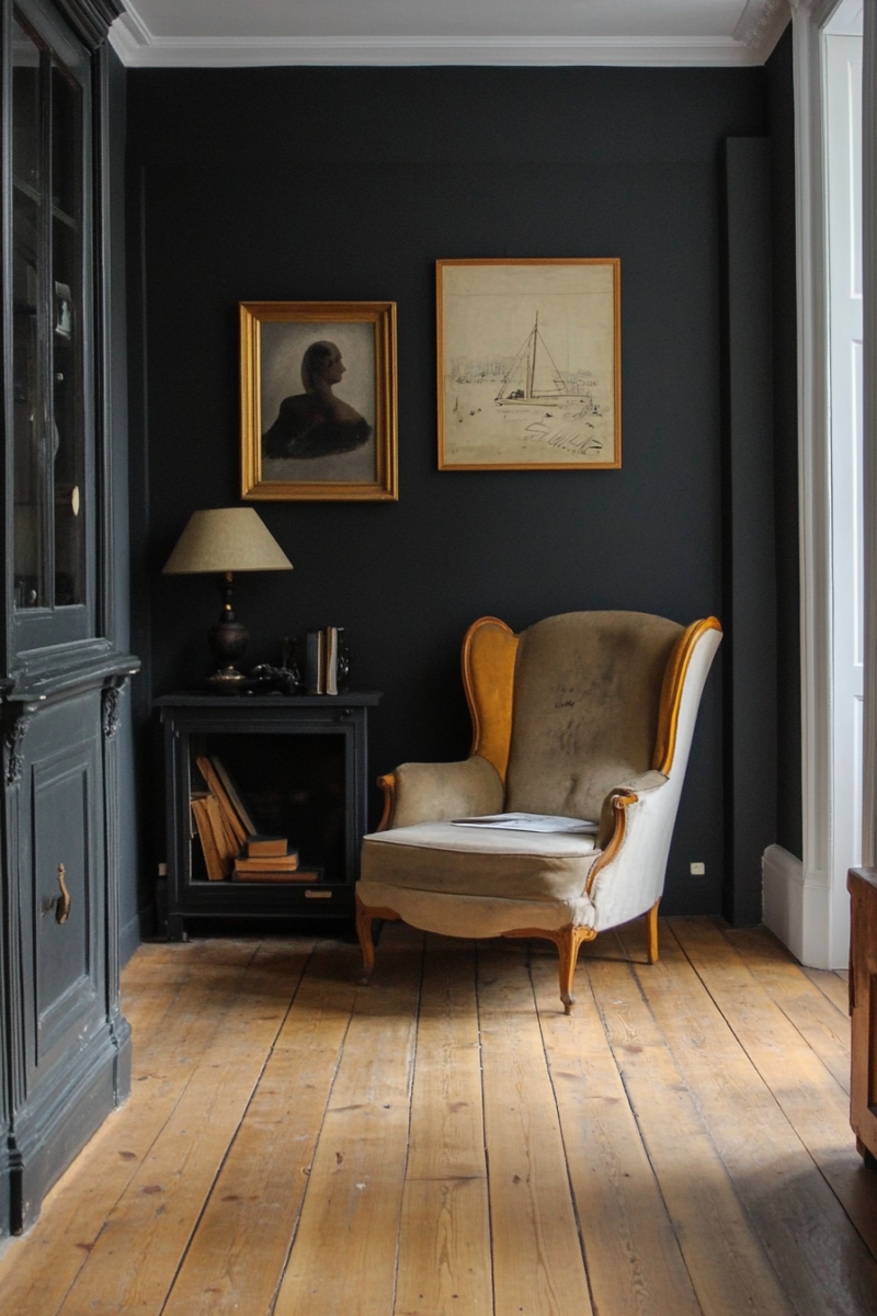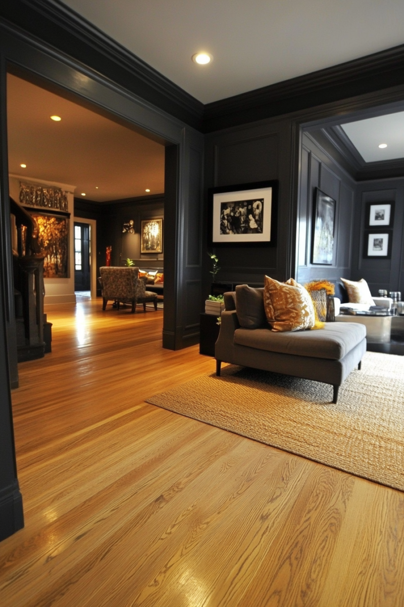 This deep, rich shade creates a striking contrast with golden oak floors, giving your room a modern, high-end feel.