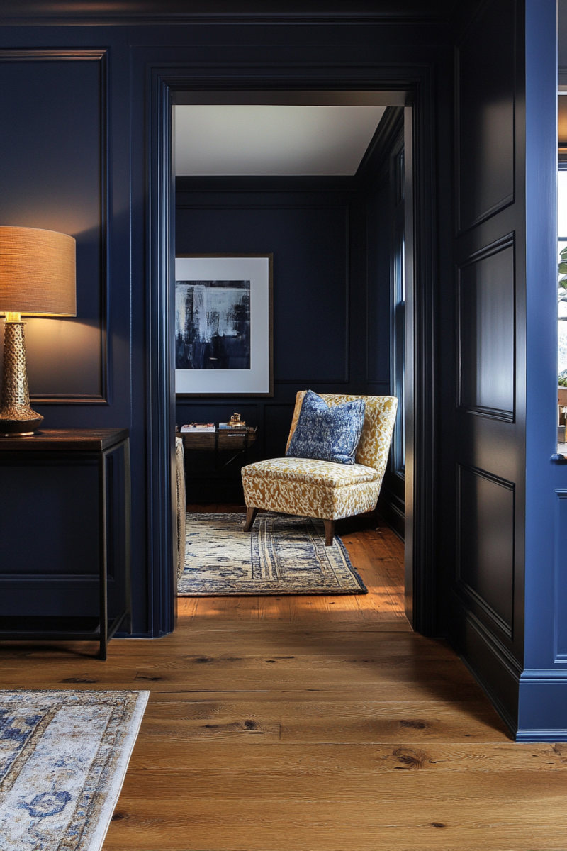 Navy blue is a bold and sophisticated choice that pairs beautifully with golden oak floors.