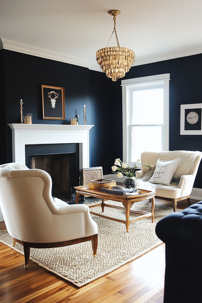 To prevent the room from feeling too dark, balance navy walls with light-colored furniture or trim.
