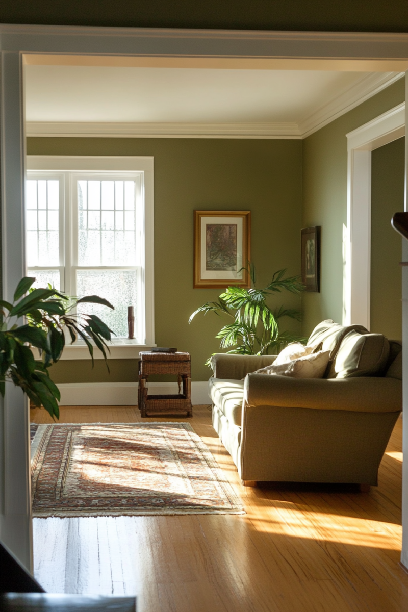 Olive green is a bold yet versatile color that adds depth and character to any space, making it a perfect companion for your golden oak floors.