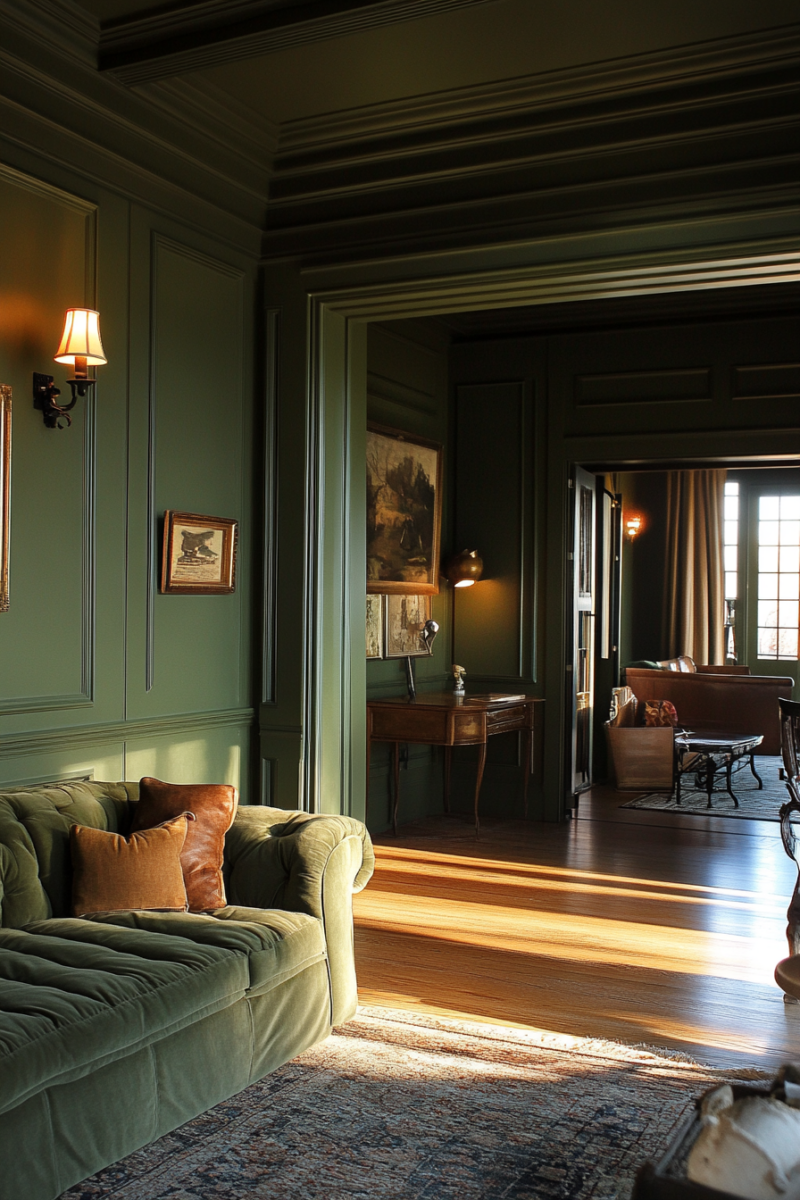 Olive green works particularly well in dining rooms, offices, or even entryways where you want to make a strong yet natural statement.