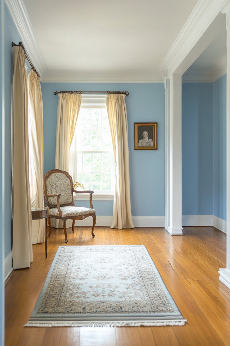 For a coastal-inspired look, pair soft blue walls with white trim, wicker furniture, and natural textures like sisal rugs or linen curtains.