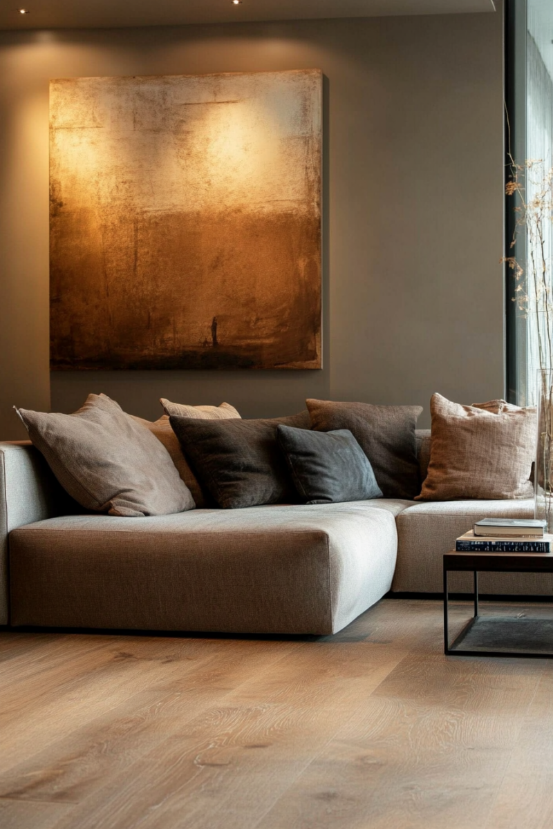 If you want to add a pop of contrast, deep greens or navy accents can look stunning against mushroom beige walls and golden oak floors.