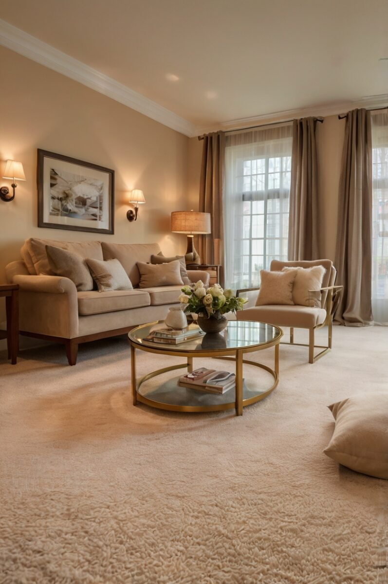 Warm beige paint creates a seamless flow with light brown carpet that feels elegantly cohesive.