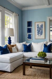 Add red accessories for an American or nautical theme, or green plants for a natural, peaceful vibe.