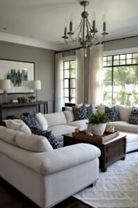 If you prefer a cozier, more traditional style, a plush gray sofa with rounded arms works beautifully with cream backgrounds.