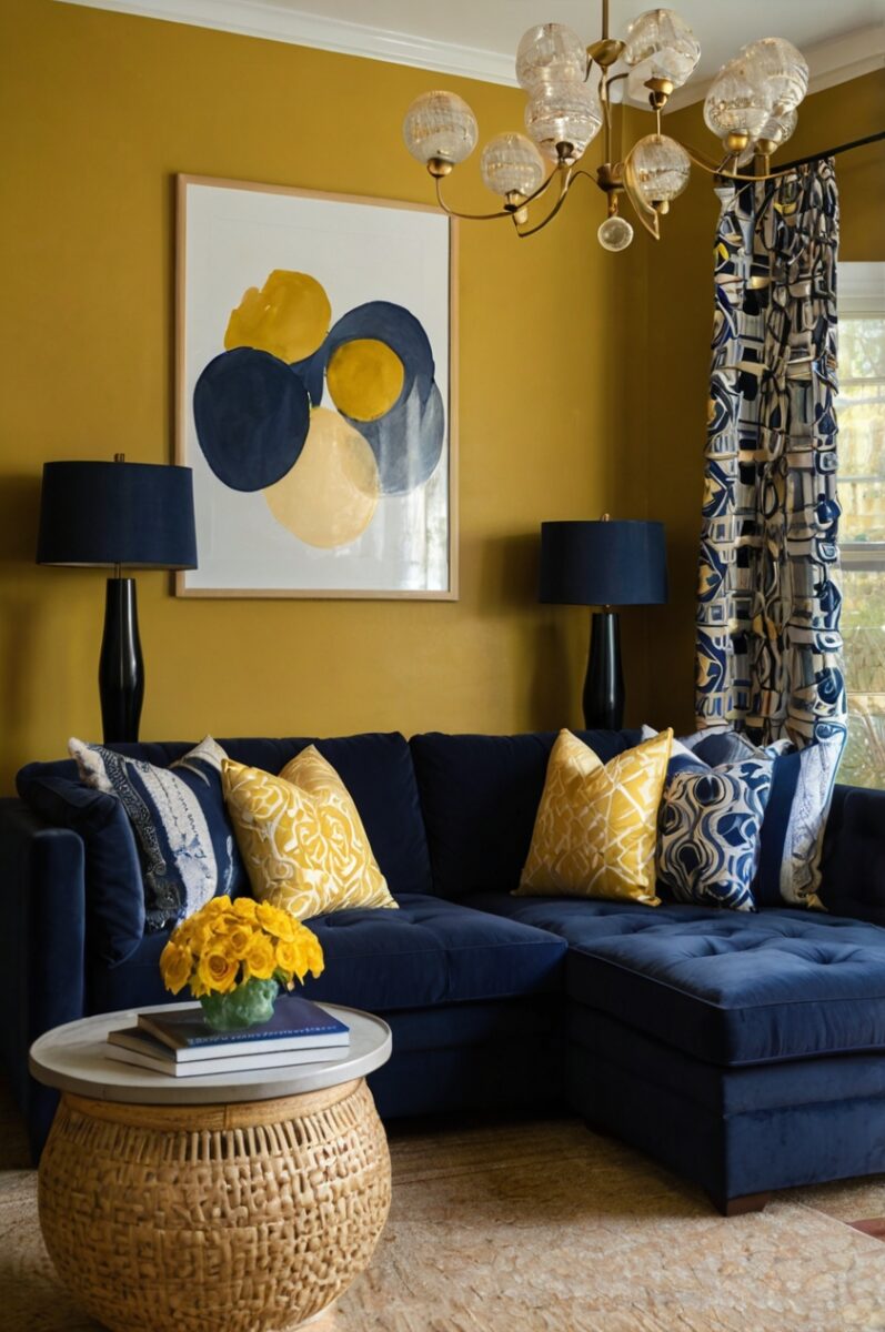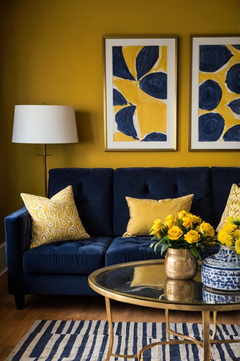 The deep blue grounds the vibrant energy of yellow, creating a balanced space that feels both lively and calm.
