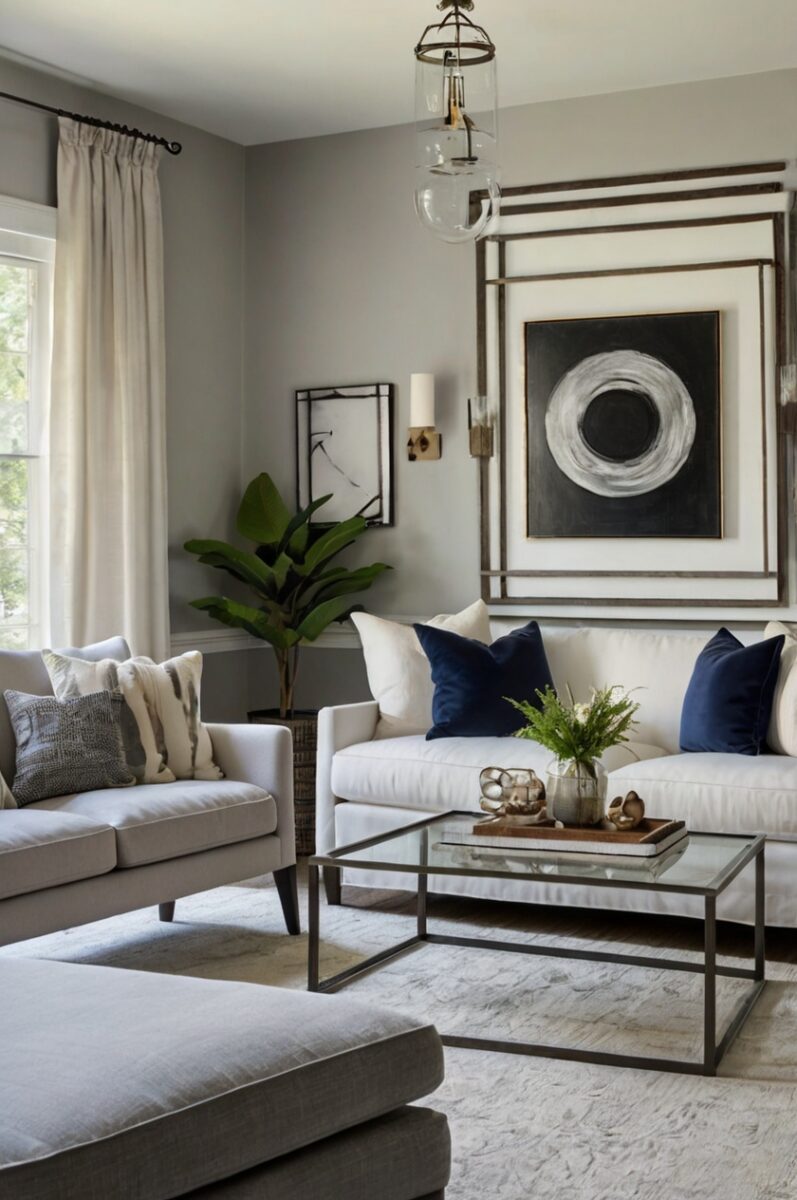 Navy blue sofas create a stunning anchor against light gray walls, offering depth and sophistication.