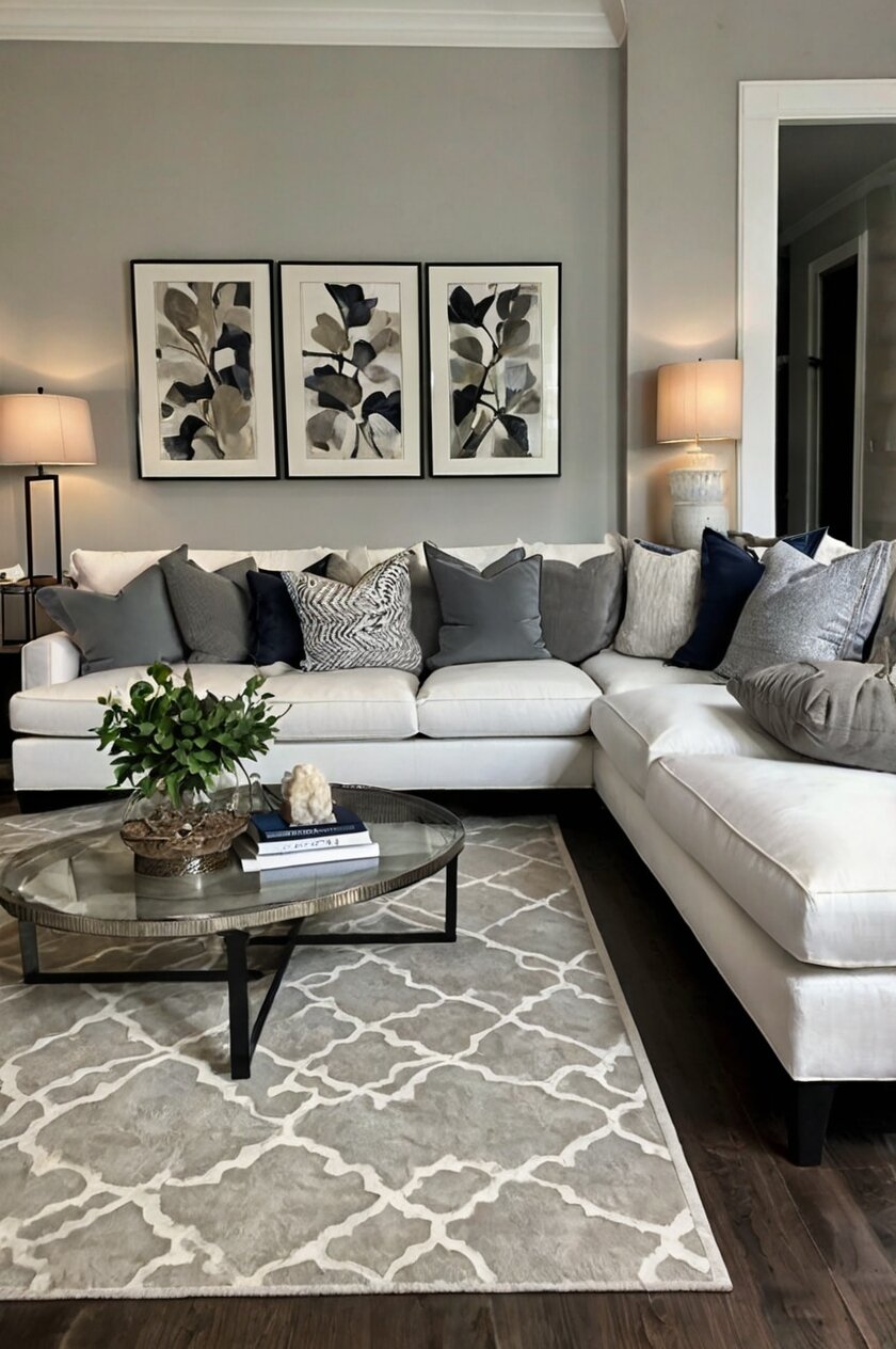 When accessorizing a white sofa, metallic accents like brass or chrome look particularly striking against the light gray background.