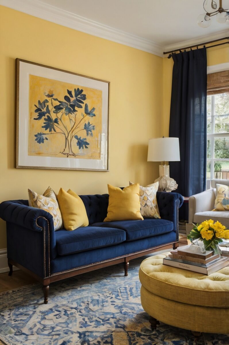 Navy blue creates a striking contrast against light yellow walls that instantly adds sophistication to your space.