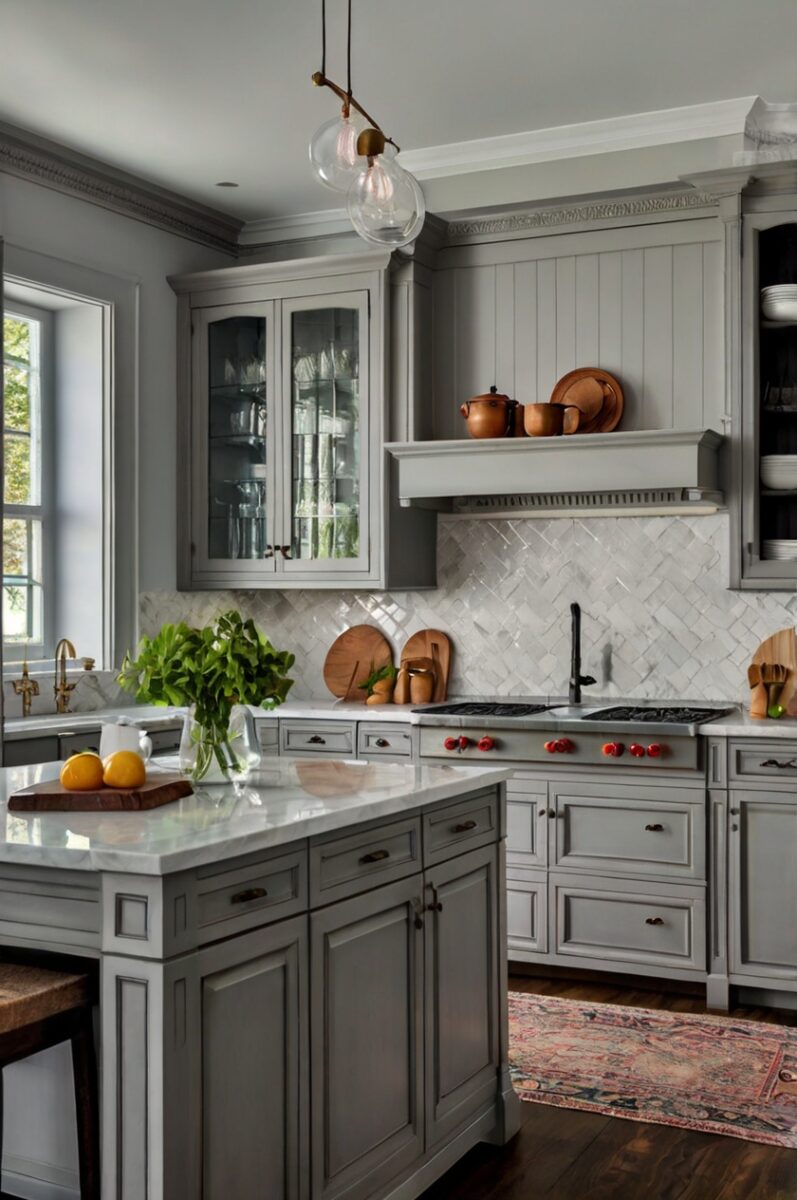 The gray and sage palette creates a perfect backdrop for vintage or antique pieces that add character to your kitchen.