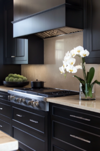 This dark-on-light approach turns your kitchen into a statement space that commands attention.