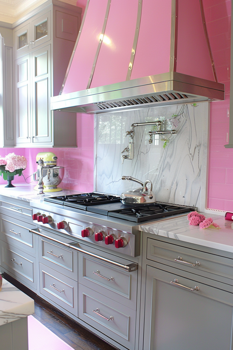 While gray cabinets can lean sterile if not balanced right, pink offsets this nicely.