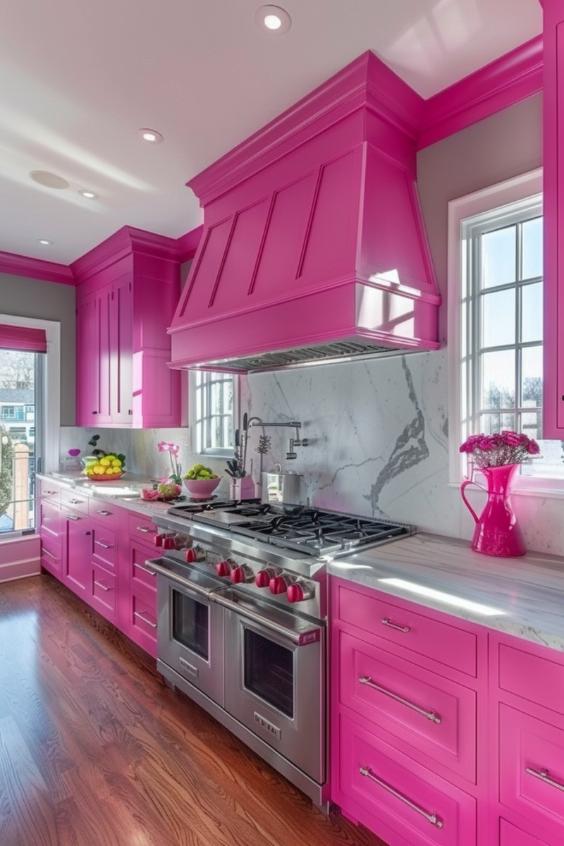 The vibrant walls make even the most basic cabinet style look intentional and designer-chosen.