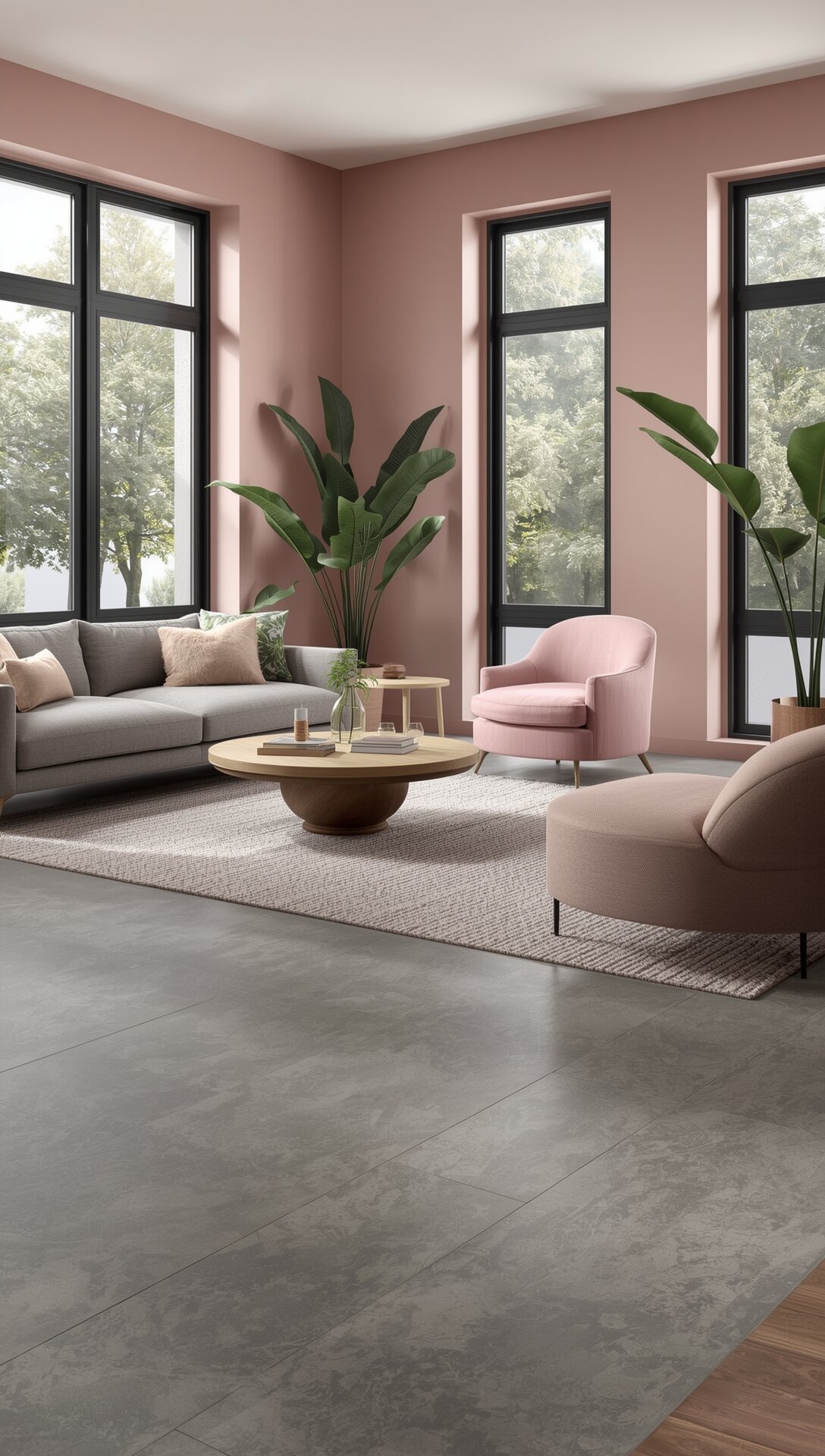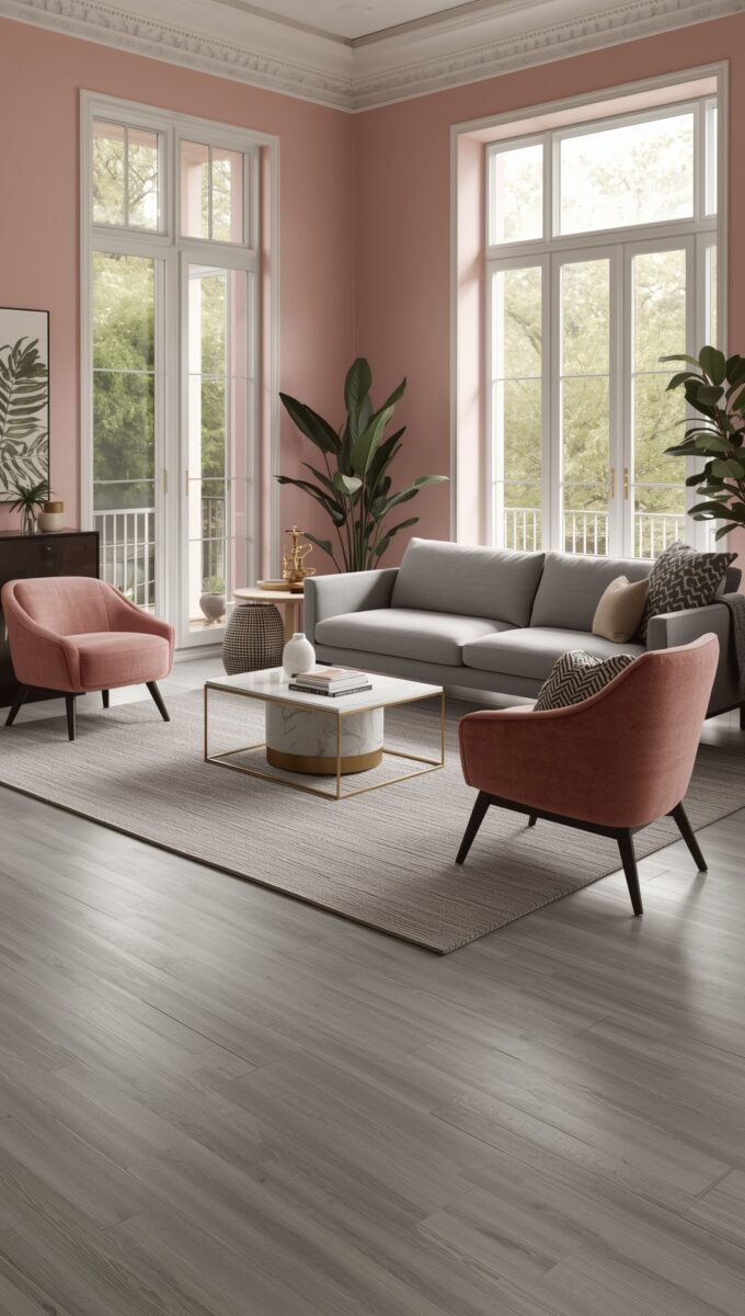The coolness of gray floors balances the warmth of blush perfectly—it’s this gorgeous dance between masculine and feminine.