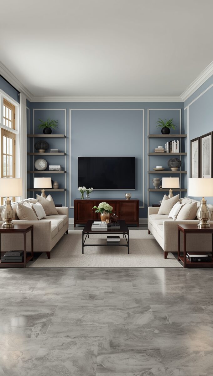Balance the cool tones with warm wood furniture and brass or gold fixtures.