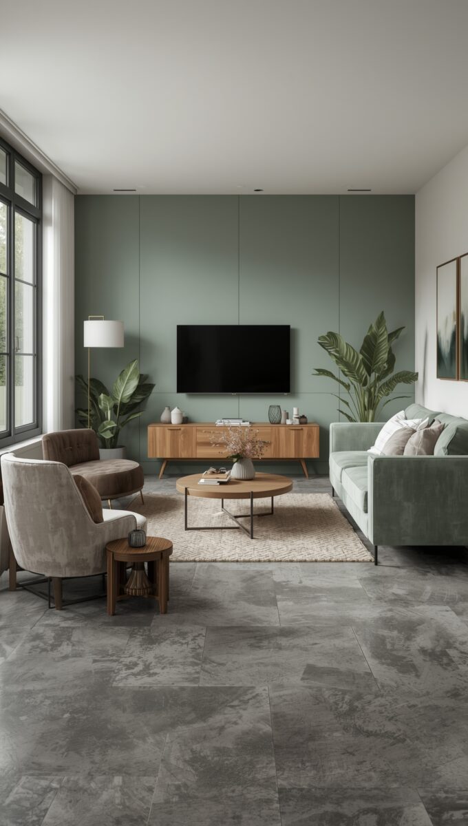 Warm gray floors also work, but I’d choose a slightly warmer sage with more olive undertones.