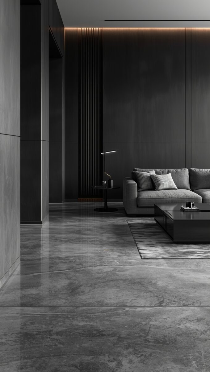 Gray floors prevent the black from feeling too heavy or gothic—they lighten the overall mood.