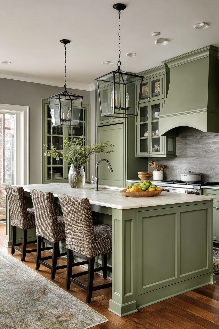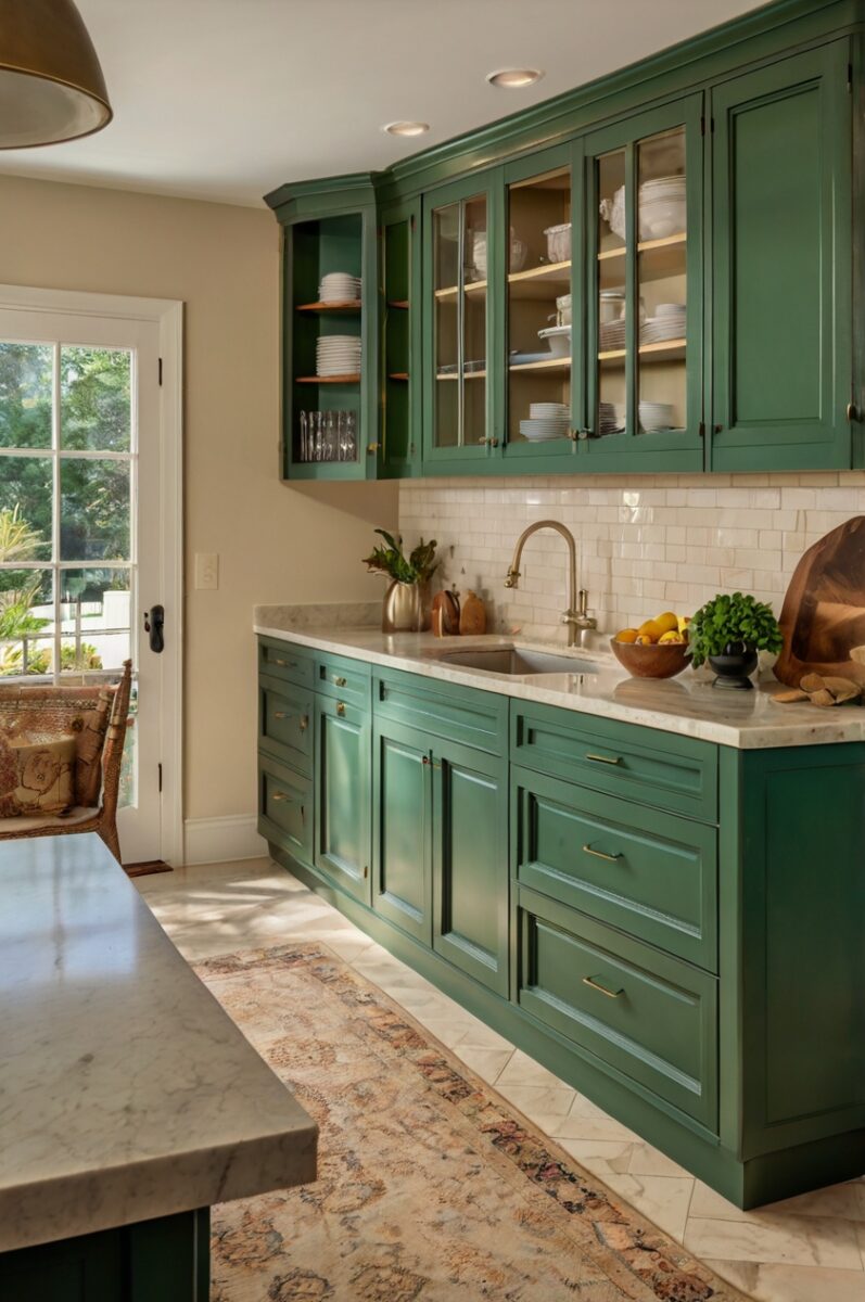 Beige walls provide a timeless, neutral backdrop for green cabinets.