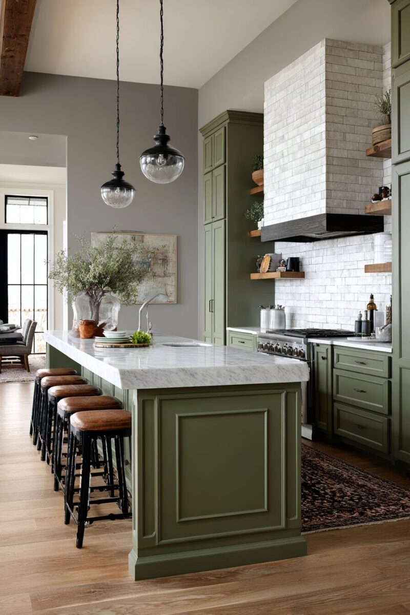 Cool-toned creams can make green cabinets look muddy or unpleasant.