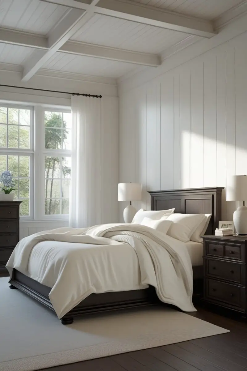 Pairing a white comforter with dark wood furniture creates stunning contrast.