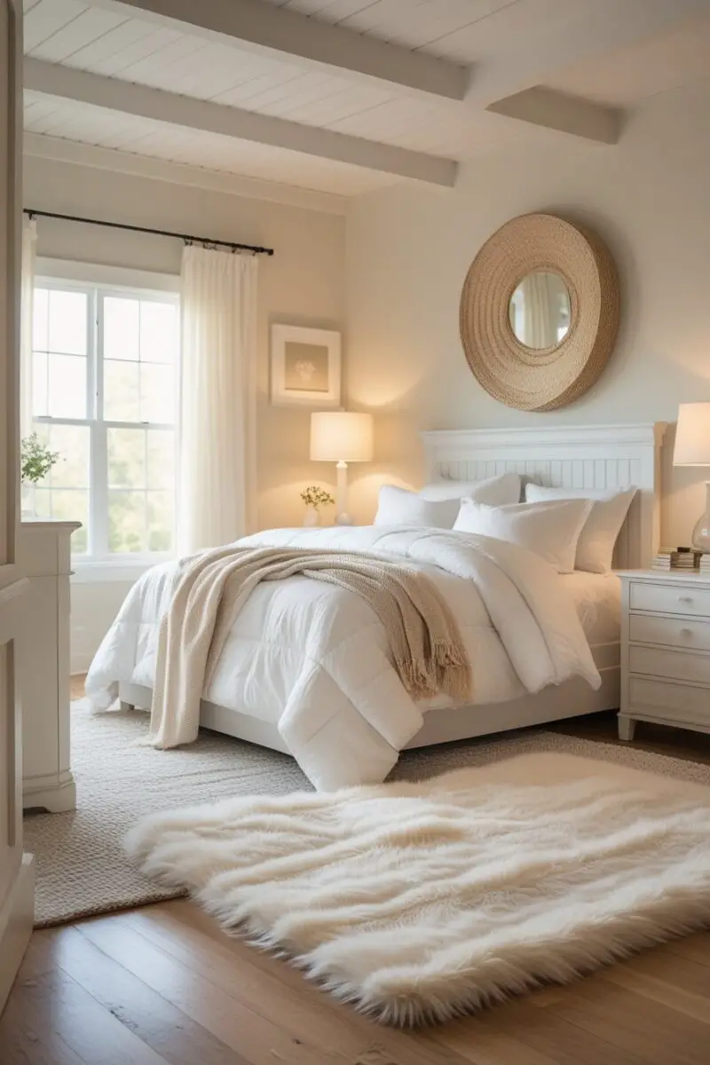 A white or cream shag rug feels amazing under bare feet and complements white bedding beautifully.