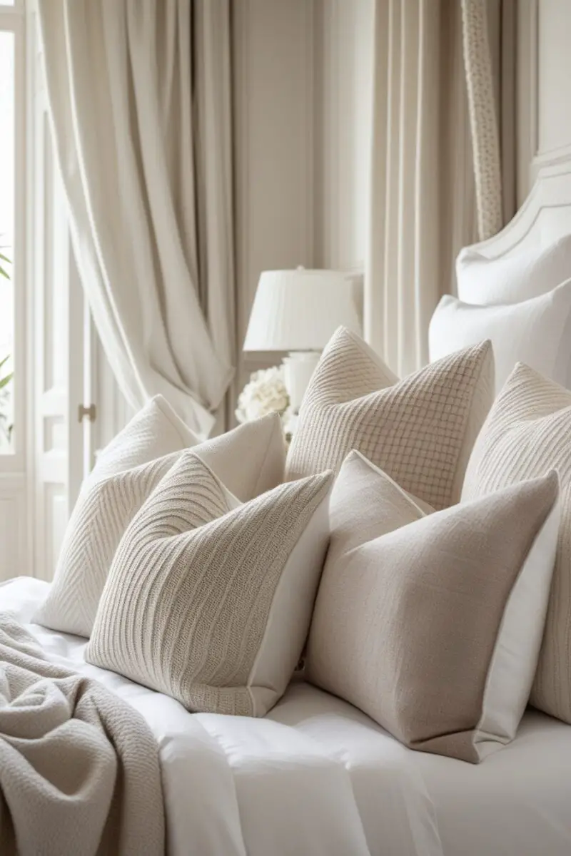 Beige throw pillows with subtle textures like velvet or linen work perfectly here.