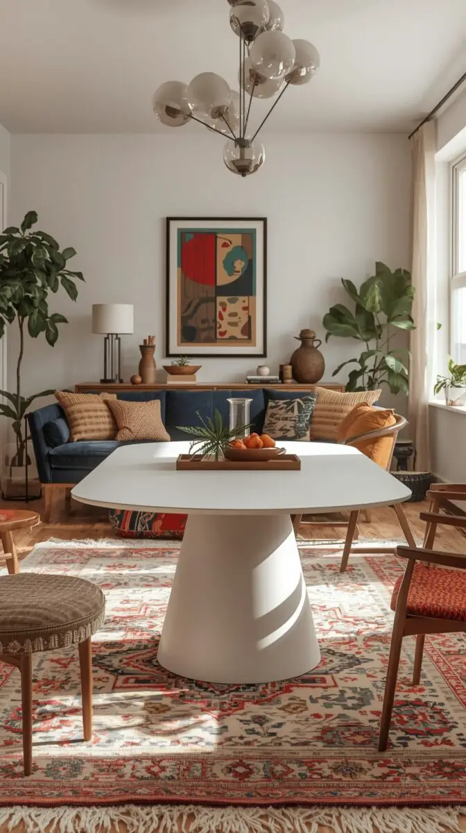 You can emphasize the vintage vibe with period-appropriate accessories like geometric pottery, starburst lighting fixtures, or chairs in vibrant colors that were popular during the mid-century era.