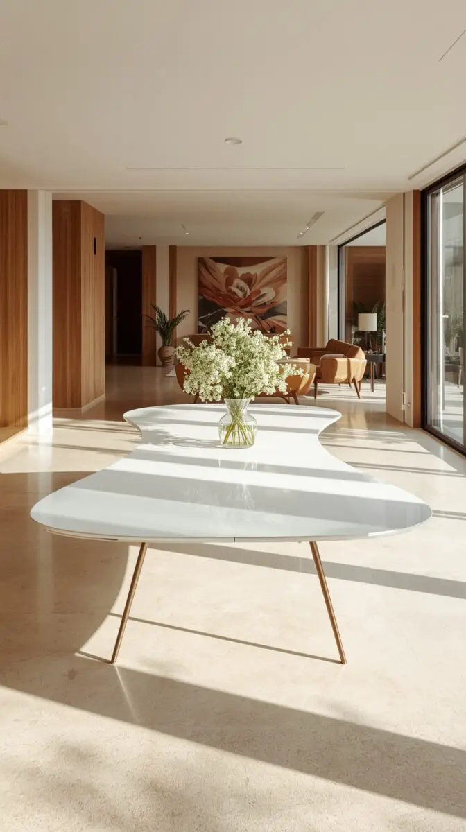 You’ll often find these tables paired with equally minimalist chairs in neutral tones, allowing the table’s clean aesthetic to remain the absolute focal point of your room.