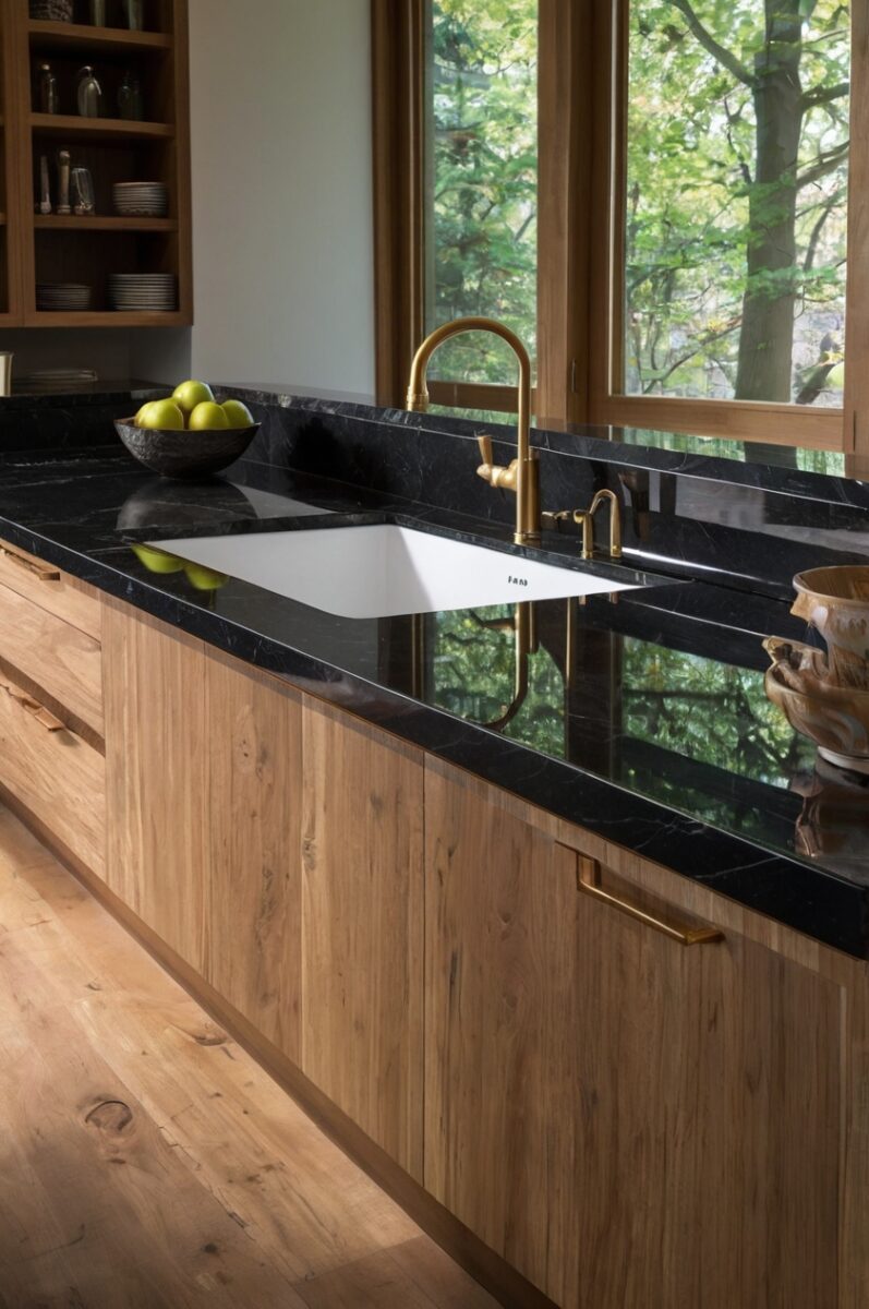 You can choose from various black stone options, from matte granite to polished quartz, each offering different visual effects against the white oak.
