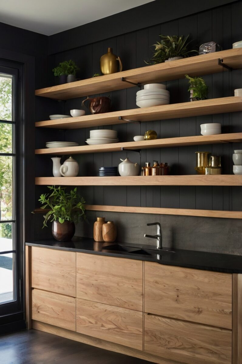 🏡 Start Creating FREE →Open Shelving Showcase: White Oak Floating Shelves Against Black Cabinet Backdrop